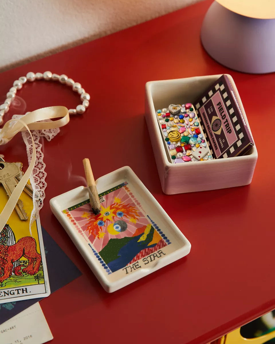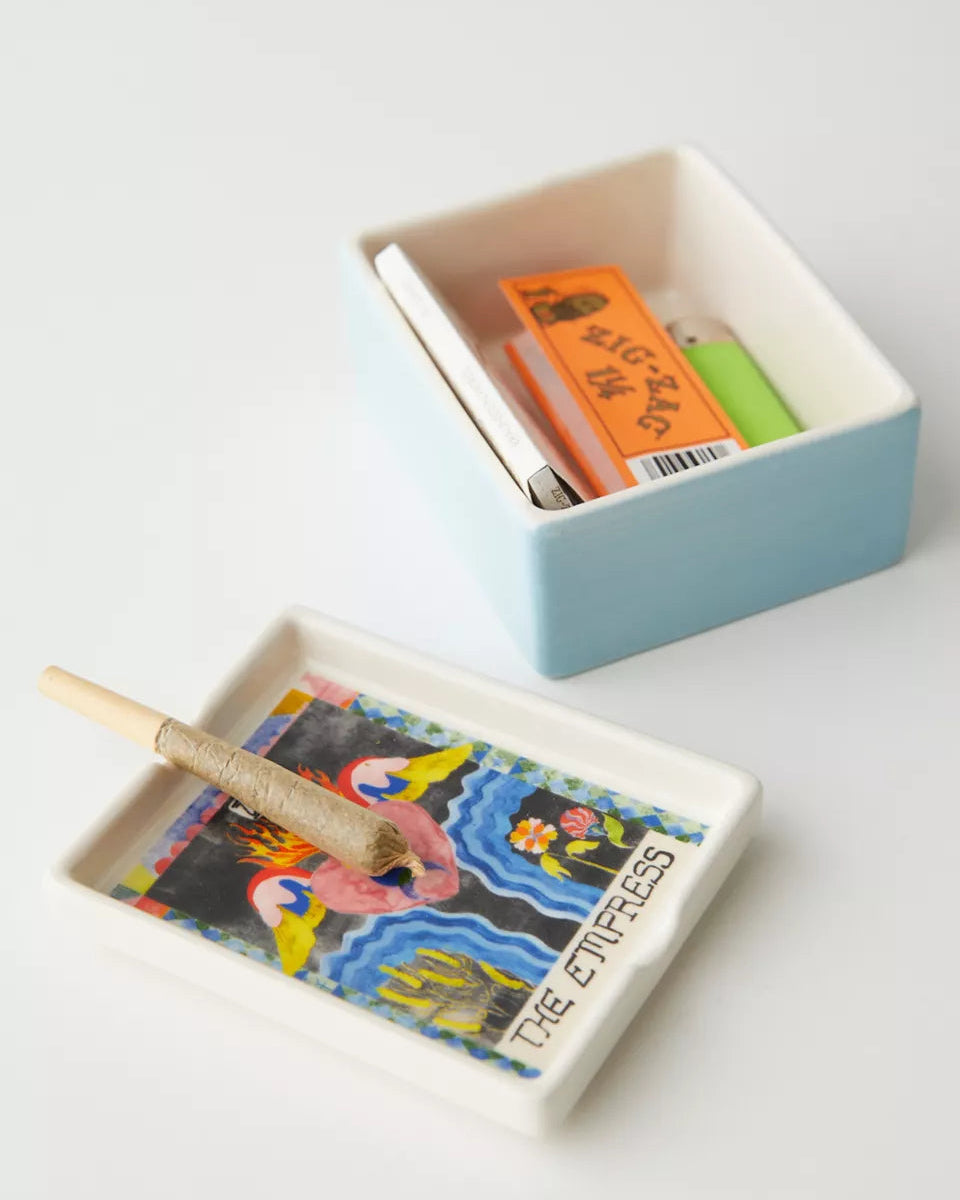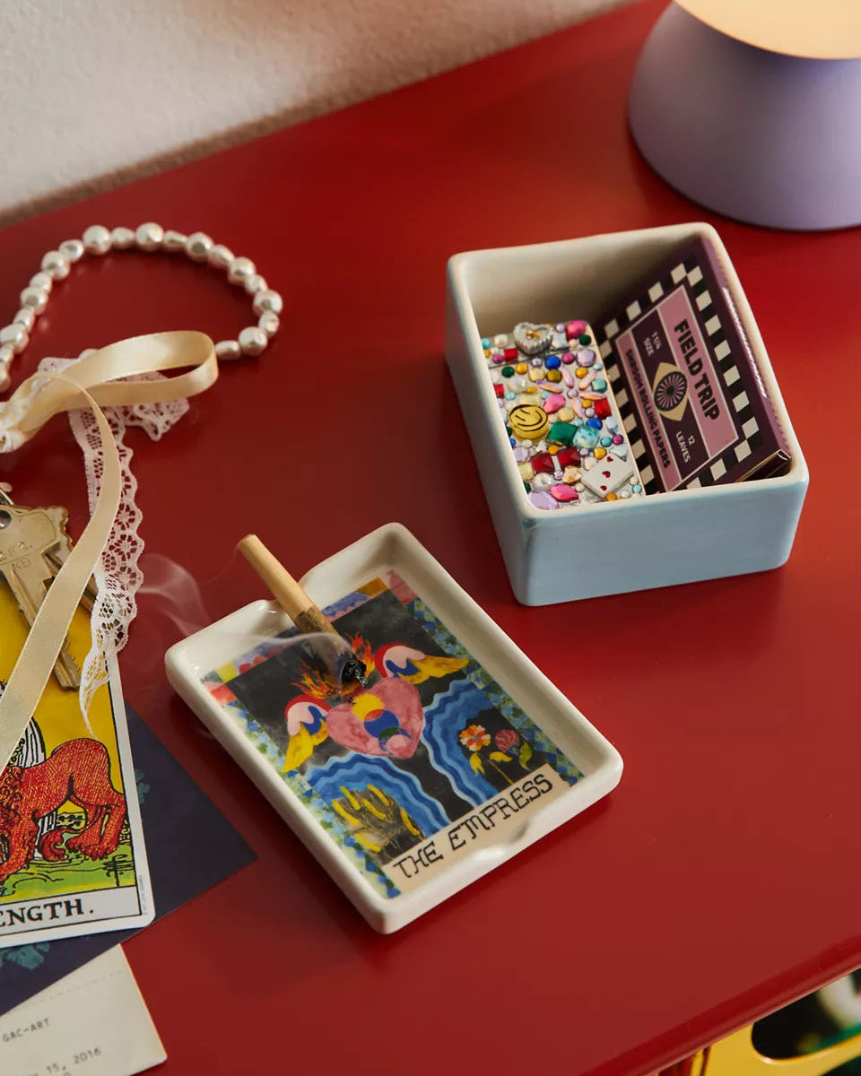 讓你的香草有地方休息,也能同時收納火柴盒——這是一款集煙灰缸與收納盒於一體的多功能陶瓷盒。頂部為塔羅牌圖案設計的帶蓋造型,邊緣刻有凹槽,可放置香草束。底部為儲物盒式設計,可收納打火機、火柴盒與其他小物。