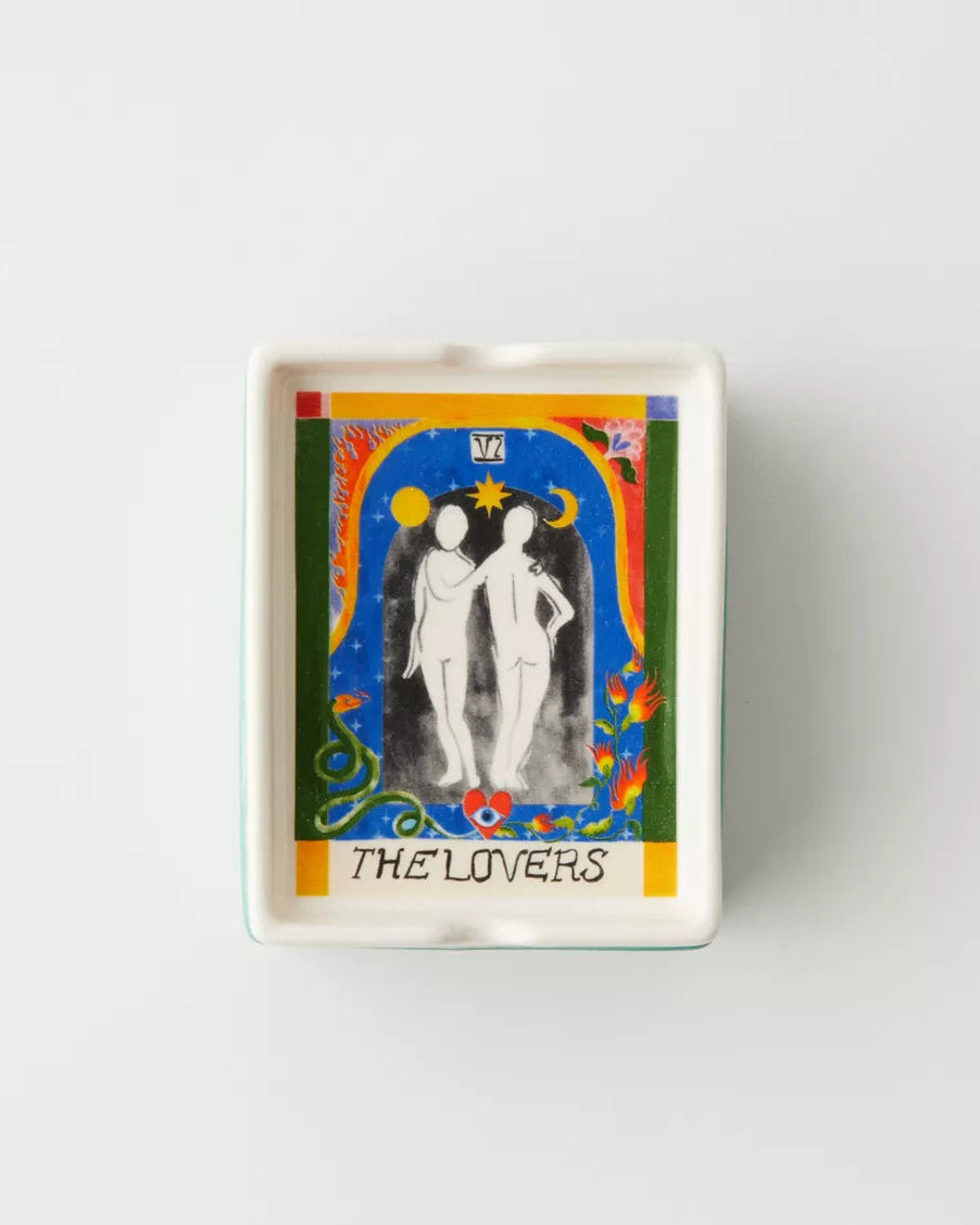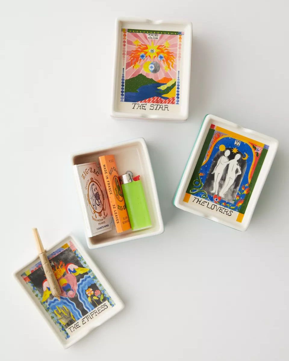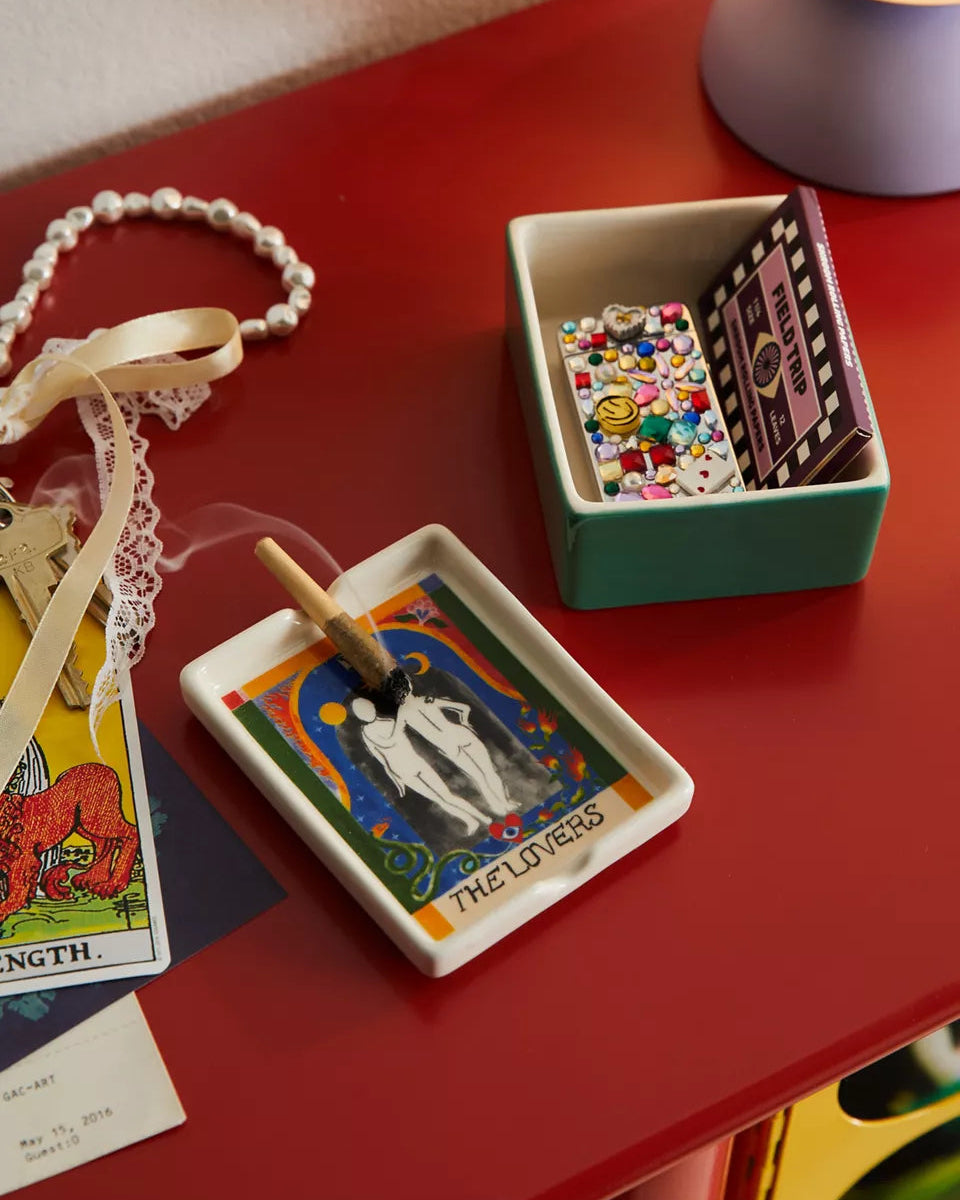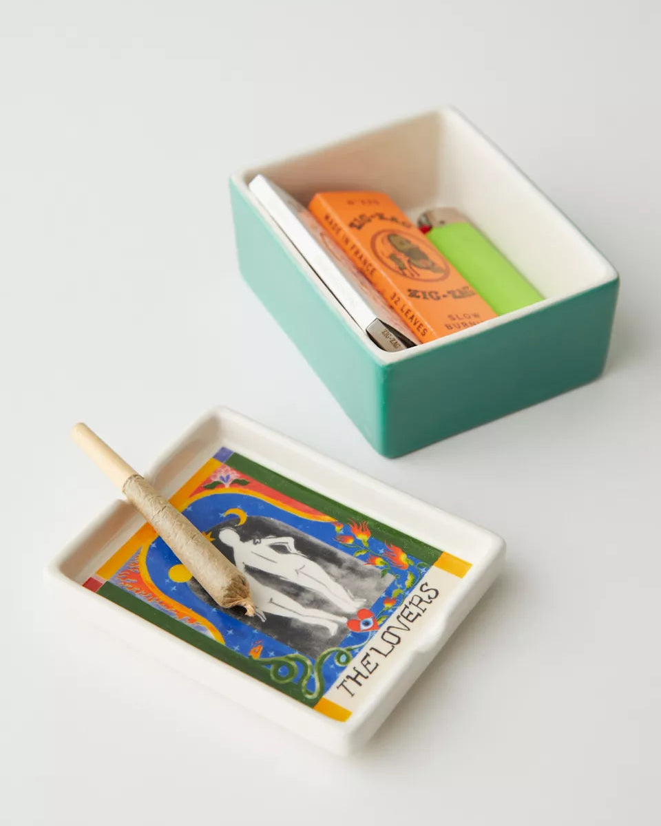 讓你的香草有地方休息,也能同時收納火柴盒——這是一款集煙灰缸與收納盒於一體的多功能陶瓷盒。頂部為塔羅牌圖案設計的帶蓋造型,邊緣刻有凹槽,可放置香草束。底部為儲物盒式設計,可收納打火機、火柴盒與其他小物。