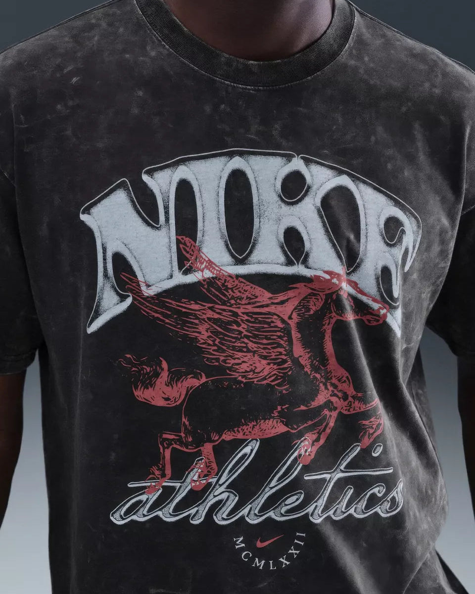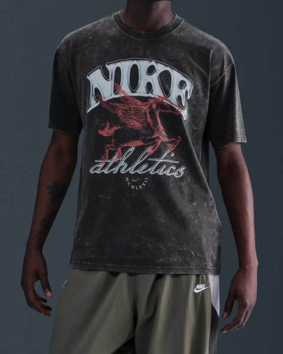 Nike 經典 Max90 版型短袖 T 恤,以高品質純棉針織布料製成,正面印有 Pegasus 主題圖案,展現運動與街頭風格的完美融合。寬鬆落肩剪裁,適合日常穿搭或運動時穿著,舒適又有型。